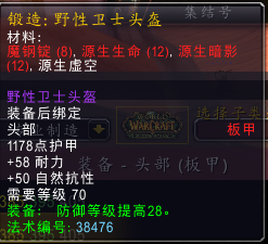 头部:锻造专业出品的野性卫士头盔,图纸需要塞纳里奥远征队声望崇敬购买,附魔同样是塞纳里奥远征队声望,尊敬即可购买。