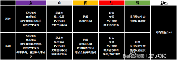 紫色:经验加成、金币加成、减少受到暴击伤害、增加PVP攻击、概率获得,受到暴击率减少