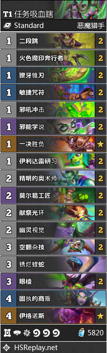任务吸血瞎:现在的吸血瞎可以说是环境中的霸主了,和法师术士同样都是自闭卡组,但是快攻抗性却很强。法师术士会被快攻抓,吸血瞎可以反过来追着快攻抓,还能抓法师术士,体现出那叫一个全面。而之前令人头疼的牧师,在新版本的上线便已经被淘汰,即便碰到起手有313的牧师,换牌时机的对牧师来说变得愈发飘忽不定。任务的加入使得xxx的马速大大加快,五六费杀人已经是家常便饭了,甚至为了提升二段跳的稳定性,使得伊利丹抛弃了当年的过牌核心:古尔丹之颅。携带固执的商贩+2亡语刀的构筑乍一看感觉非常蠢,但是细细一品你会发现这让整个卡组的过牌变得更加丝滑,更加容易触发前两阶段的奖励。同时携带了蛇软来反制环境中术士萨满等职业的刀,即便是打其他职业抽到了,也只需花1费换回去抽1张,可以说dh是可交易机制的最大赢家了。而第3阶段577的奖励只是锦上添花,极少对局是靠577下去后赢的。