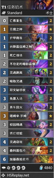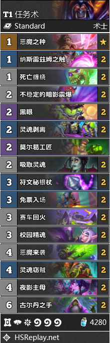 任务术:首先是最初的任务术,依靠免票入场稳定减费快速启动,基本上4-6费就可以做完任务,如果手速够快,当回合就可以完成斩杀,最快的otk也是没谁了,起手找刀和免票入场,直接搏上限就可以,卡组整体相对自闭,且容错率不高,如果不熟练的话很容易白给,但是斩杀回合留给玩家思考的时间几乎没有,抽到牌之后打出顺序需要玩家多练习之后才能熟练掌握,刚开始玩的话,什么爆掉577或者577被455弃牌都是很常见的事情。而且随着版本理解的提高,这种任务术的缺点也体现出来了,就是恢复能力薄弱,如果血量吃紧根本做不了任务,面对法师骑士猎人之类的快攻扛不住是最大的问题,尤其任务术的通病就是处理不了防护长袍,如果带了莫尔葛工匠还可以配合校园精魂解一下,但是仍然解不了骑士buff之后的长袍,所以我们认为除去固定的29张,这种任务术应该带工匠来提高面对快攻的生存能力,虽然依然面对骑士很无力,但对于其他快攻会好打很多。