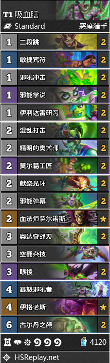 常规吸血瞎:同时也有些玩家依然在玩不带任务携带古尔丹之颅的瞎子,因为携带任务的吸血瞎携带了大量过牌而没有带奥达奇战刃快攻抗性是有所下降的。传统吸血瞎在准时能开头的情况下依然有着极高的强度,只不过在这个极端的竞速环境下,6费才开出头已经稍稍有点晚了,还有可能面对一些不讲武德的同行携带滑翔的风险,而且别人看你瞎子1费不挂任务,手里如果有小塞布大概率就会留着6费卡古头,种种问题就使得不带任务的吸血瞎表现逊色于前者,只是局部框架的大同小异无法影响它依然有着极高的强度,同样推荐对自己大局观有信心的玩家上分使用。