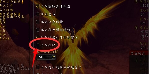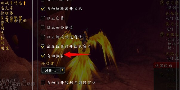 5、这个界面的中间,有一个选项叫做自动拾取,玩家需要在前面的框架内点击一下,勾上对号。