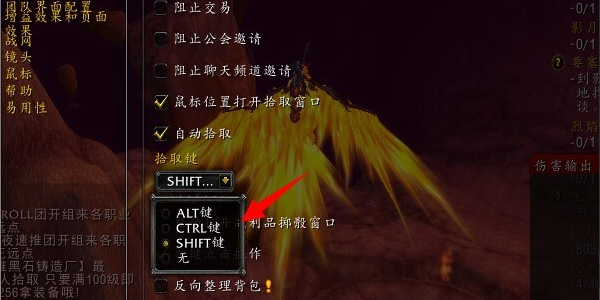 7、对于拾取,可能有的东西对玩家来说是没用的。可以点击下面的框架,选择拾取快捷键。这样,玩家就可以根据个人的意愿选择自动拾取还是手动拾取了。