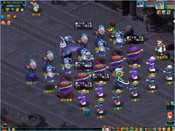 中元节期间每当黑夜降临(每个小时55分),长安城(465,28)附近将出现僵尸阵列队伍,万鬼集结奇袭长安。加入对战的僵尸和道士玩家都将获得战绩翻番的效果,快来决一死战吧!