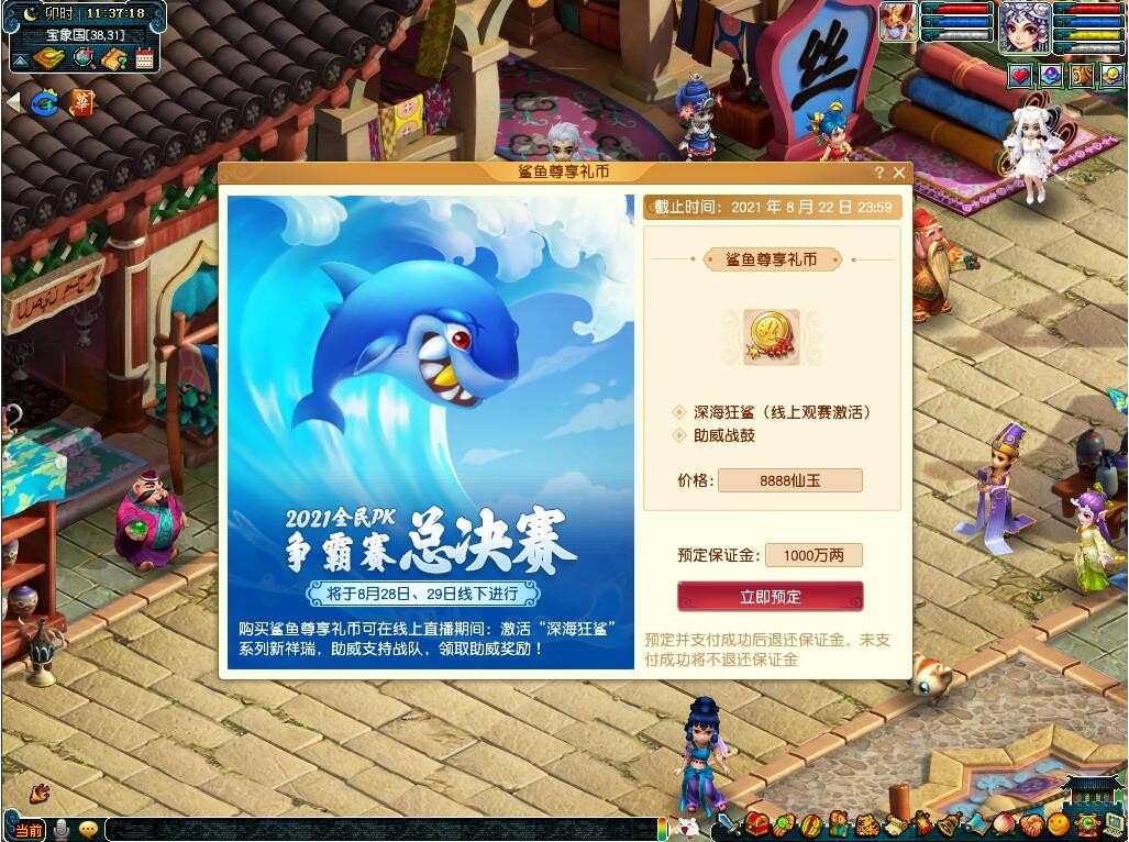 梦幻西游鲨鱼尊享礼币活动具体的内容:活动期间,每天12:00、20:00,系统开启全服抢购,先到先得,售完即止。玩家可前往宝象国(35,27)的线下PK赛使者处花费1000万两订金进行预订(无需全面解锁).