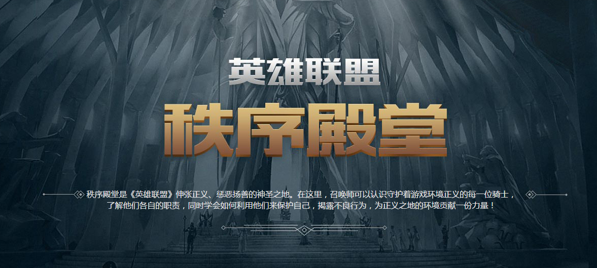 秩序殿堂是《英雄联盟》伸张正义、惩恶扬善的神圣之地。在秩序殿堂里,四大仲裁骑士和五大守护骑士将一同帮助召唤师们伸张正义,惩恶扬善。在这里,召唤师们可以对破坏游戏秩序的行为进行投诉,维护游戏正义,可以为自己的竞技精神和团队协作得到荣誉和奖励,也可以在被恶意举报时申诉,维护游戏公平。