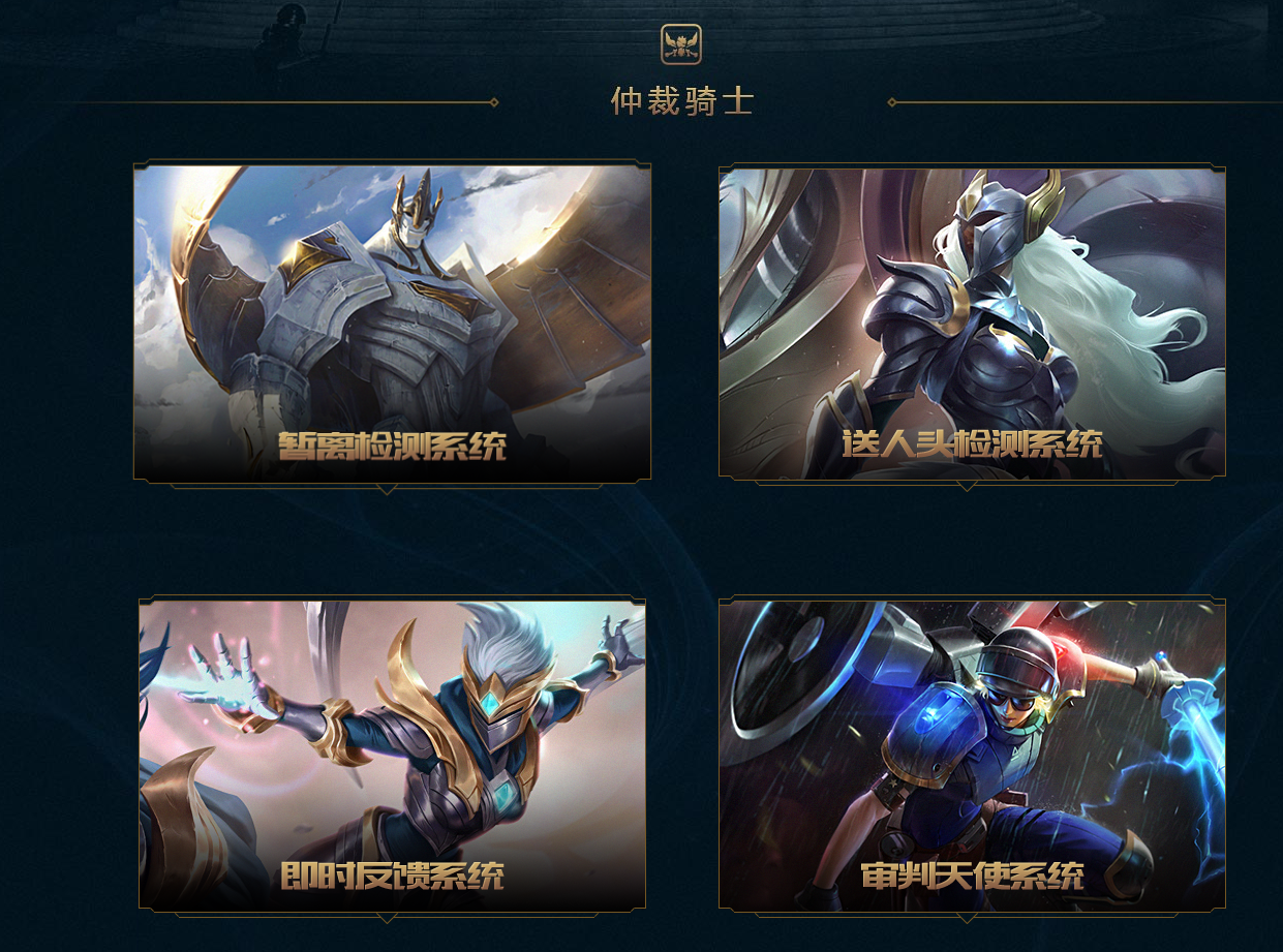 四大仲裁骑士分别是:暂离检测系统、送人头检测系统、即时反馈系统和审判天使系统。前两者,顾名思义,分别是对暂离和送人头的玩家进行检测。而即时反馈系统可以检测并记录玩家在对局中的攻击性、侮辱性等语言,接收其他玩家对这些行为的举报,并谨慎地针对召唤师的不当言行给予迅速反馈和惩罚。
