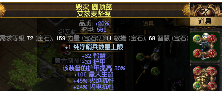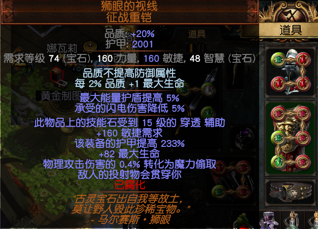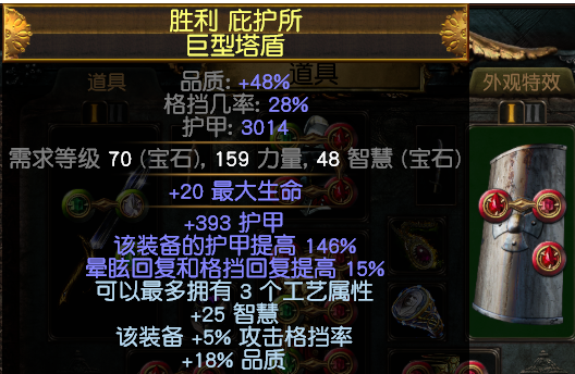 盾牌:购买大概10E 也可以自己买86物等(86才能出T1百分比)的巨型塔盾 完美化石点出30品质 然后致密化石单孔点