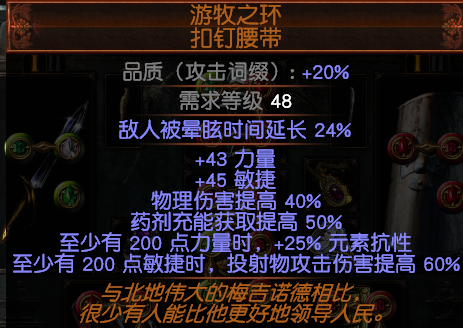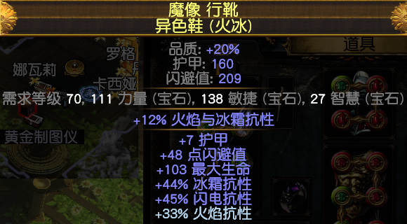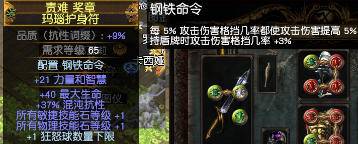 项链:觉醒石做的 成本大概5E 涂油必备 钢铁命令(可以用信念之砧 琥珀护身符代替 加格挡上限 提升生存)