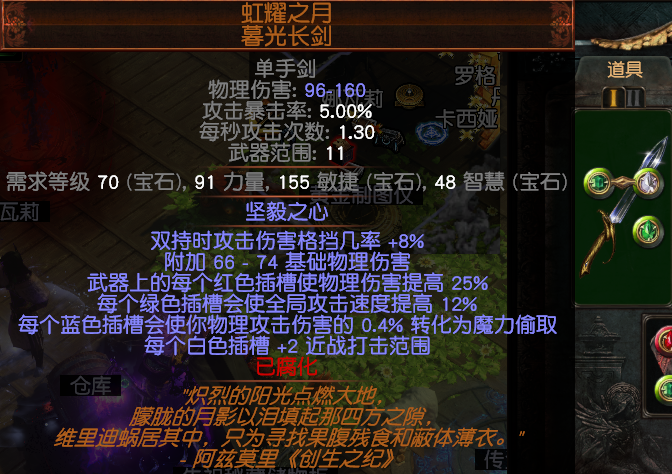 武器:虹耀之月 绑定 (最好瓦出坚毅之心 能省下四点天赋)必须三绿孔 能提供36%的全域攻速
