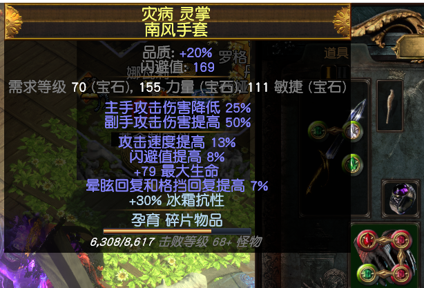 手套:笨重手套,南风手套,左旋手套 都是提升副手攻击伤害的 看看哪个价格最低 主要需求属性 生命,攻速 就行 提升中等