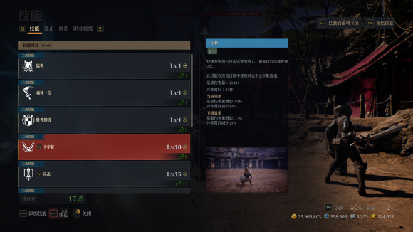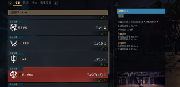 接下来是十字斩,十字斩的优先级不高但是必带,虽然他的伤害不高但是能充三层一般有两个用处 boss机制近战不能靠近时用十字斩来挂上正面交锋的buff,其次就是快速刷新反击的cd。所以不带十字斩会掉很多输出,这个不能因为输出低就不带。我技能点够所以点到10级减13%的cd,技能点不够就酌情减少