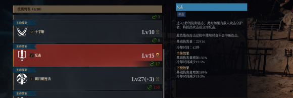 然后就是反击我是点到15级有19.5%的冷却缩减就变成33秒,和后面使用斩击技能减32秒结合可以无缝使用。如果技能点不多或者神佑点不高就酌情增减