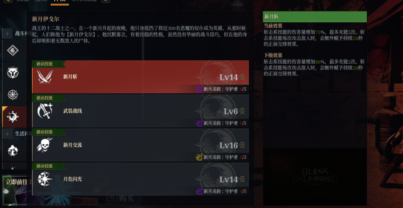 其次加1 新月斩。这个是加斩击伤害,主要提升输出的神佑所以也要点比较高。因为钱不够我只点到了14级。