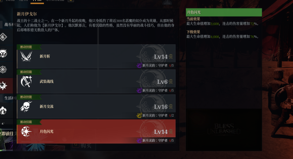 然后是4月色闪光。主要加生命值和平A的伤害,平A也是新月的伤害来源。所以这个也需要点比较高,没钱只能点到14.