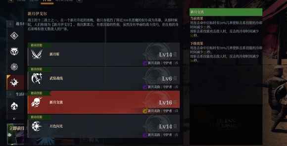 优先加3 新月交流。新月交流尽量点到16级,斩击技能可以减反击32秒cd,配合上面反击的加点cd33秒理论情况下可以无缝使用反击-斩击-反击的循环。而且还加平A减斩击技能的cd,所以是最重要的一个神佑,必须优先点。