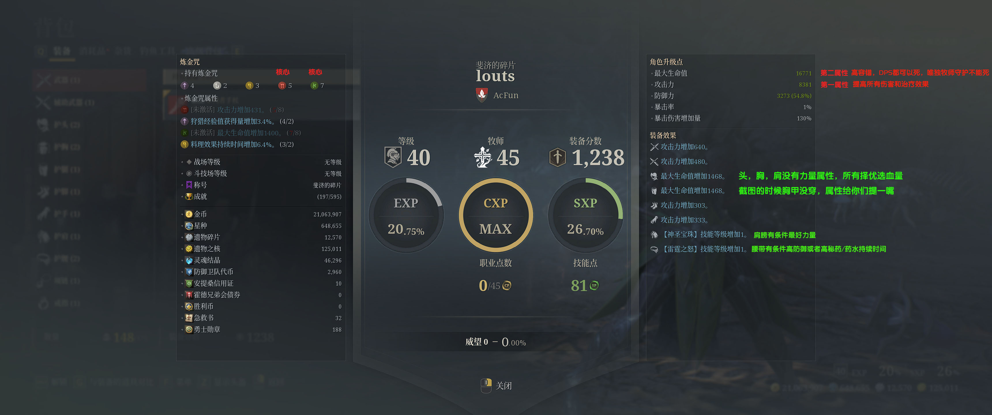 大致的都在图上标注了,这个游戏后期核心炼金符文牧师PVE最优解依然是红(攻击力加成)绿(血量加成),炼金符文是搭配饰品出的强化装备属性,需要你无限刷本刷出符合饰品的炼金符文来触发饰品属性,血量决定容错,PVE牧师不需要暴击爆伤收益太低,从35本开始秘药药水是必须吃的,所以腰带的持续时间收益非常高,配合联盟被动很大提高效率。