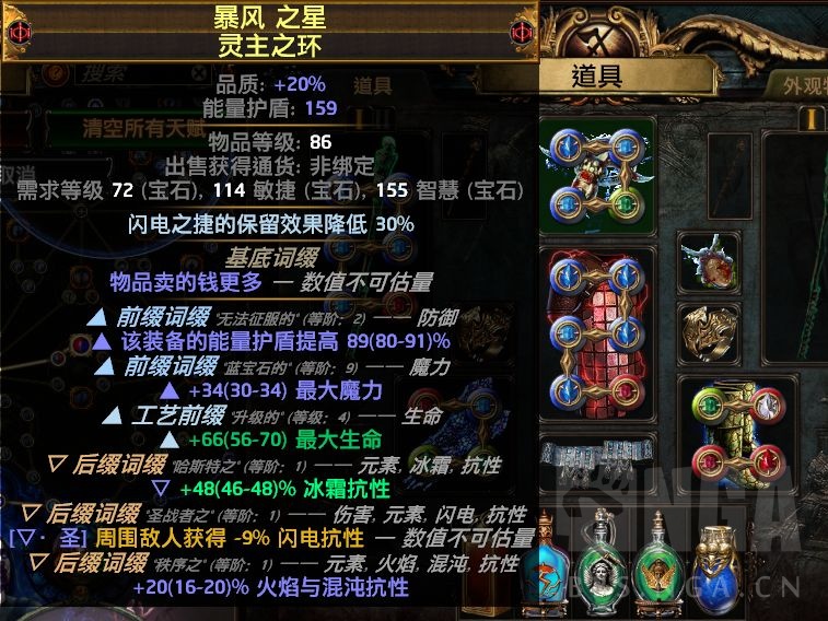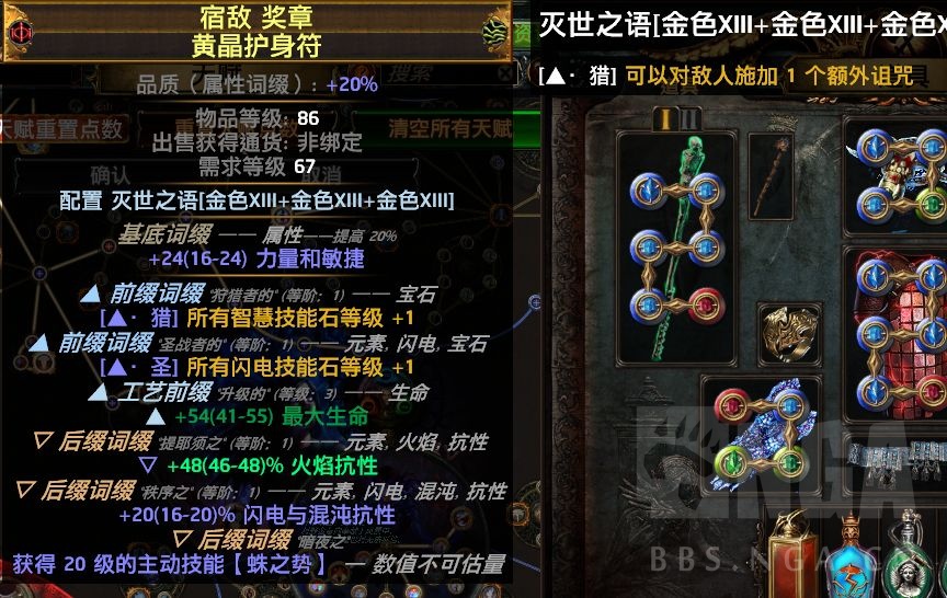 项链涂油灭世之语。 双+1项链,如果其他部位抗性够了无所谓,我这个抗性是合完之后魔物园一发圣战ex上的T1抗。其实已经溢出了,不强求。造价4ex左右。