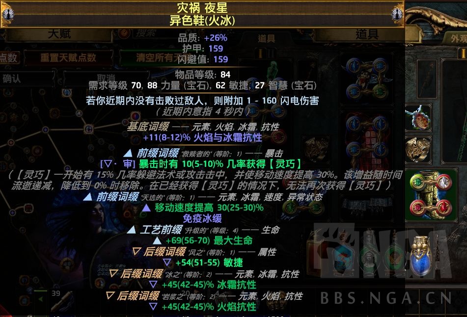 血抗鞋,我这个鞋子是冬珠bd遗留下来的,其实灵巧没什么用在这里,因为超载电捷并不会暴击,只是靠聊胜于无的风暴烙印暴击触发超载,普通血抗鞋我看了下,30移速差不多的也就2-3ex左右。附魔随意,穿抗,电点伤,免晕,每秒2%回血都是可以的。