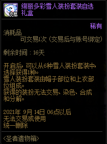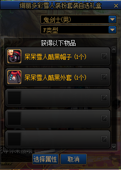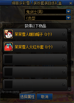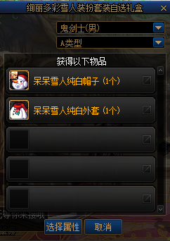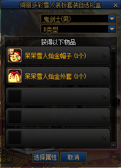 DNF绚烂多彩雪人装扮套装自选礼盒开启后,可以在白、金、红、粉、蓝、黑六种颜色的雪人两件套中选择获得一套。雪人装扮套装由帽子部位和上衣部位组成,获得的装备无法交易、合成、染色和分解。