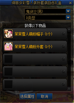 开启后,可以在白、金、红、粉、蓝、黑六种颜色的雪人两件套中选择获得一套。