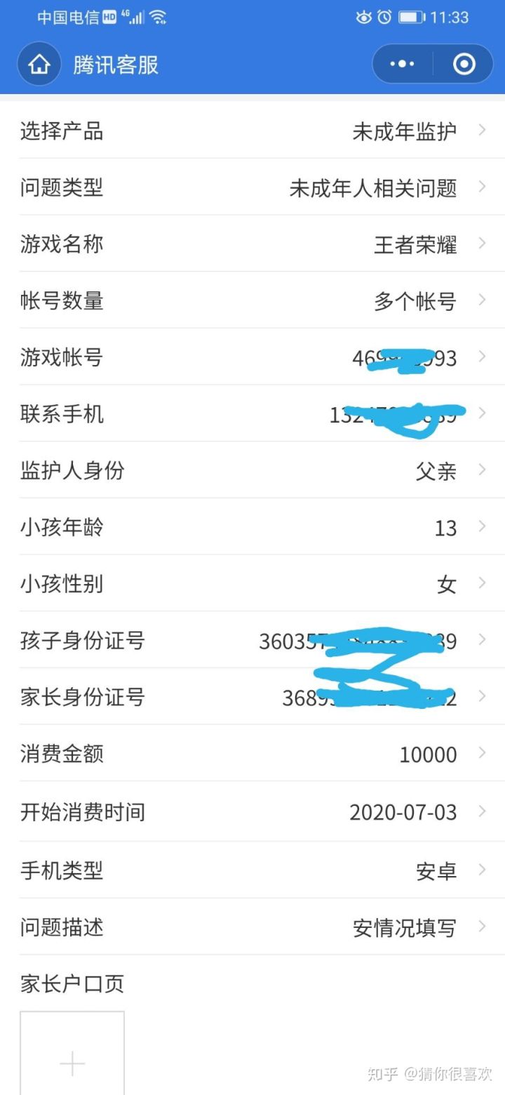 然后填写正确的个人信息及账号的身份证和家长户口页图片提交申请就可以了,一般在三个工作日回复你 注;如果没有上户口的 打预防针的本子也是可以的 具体联系腾讯客服。