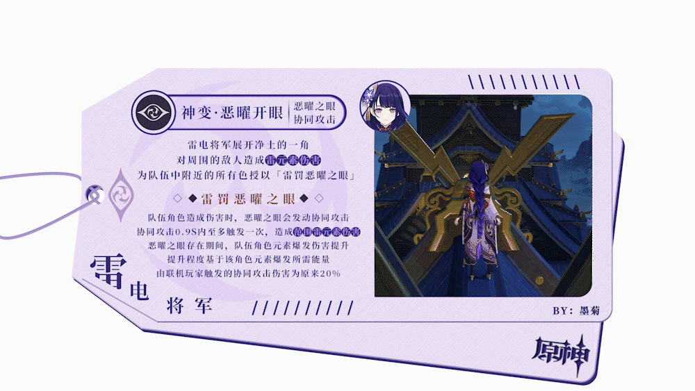 ◎联机时,由联机队友角色攻击触发的协同攻击造成的伤害是由自己角色触发的20%,且共用触发冷却时间;一个队伍里只能同时存在一个恶曜之眼,当多个雷电将军按顺序释放元素战技时,视最后释放恶曜之眼的玩家为恶曜之眼持有者。