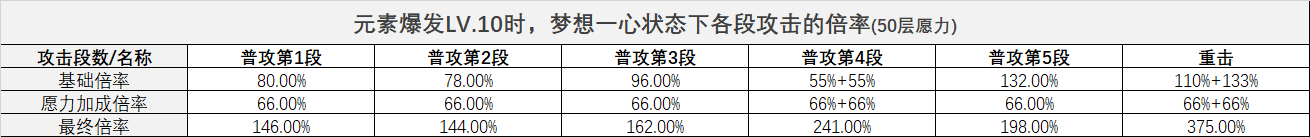 ◎梦想一心状态下的伤害倍率=“每次伤害”的倍率+愿力层数*愿力加成中“/”后的倍率