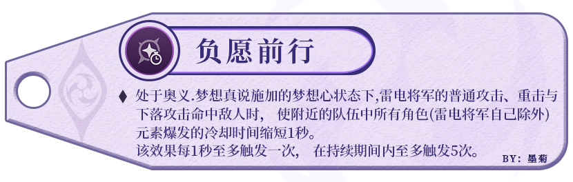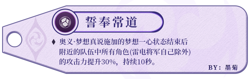 该天赋主要是配合雷电将军产球能力强的元素战技进行愿力积攒,但并不是雷电将军积攒愿力的主要方式,每次给予的层数不高,而且冷却时间较长。在当前版本趋势下,3秒提升不到70%的倍率不太可观。(倍率取元素爆发LV.10进行计算)