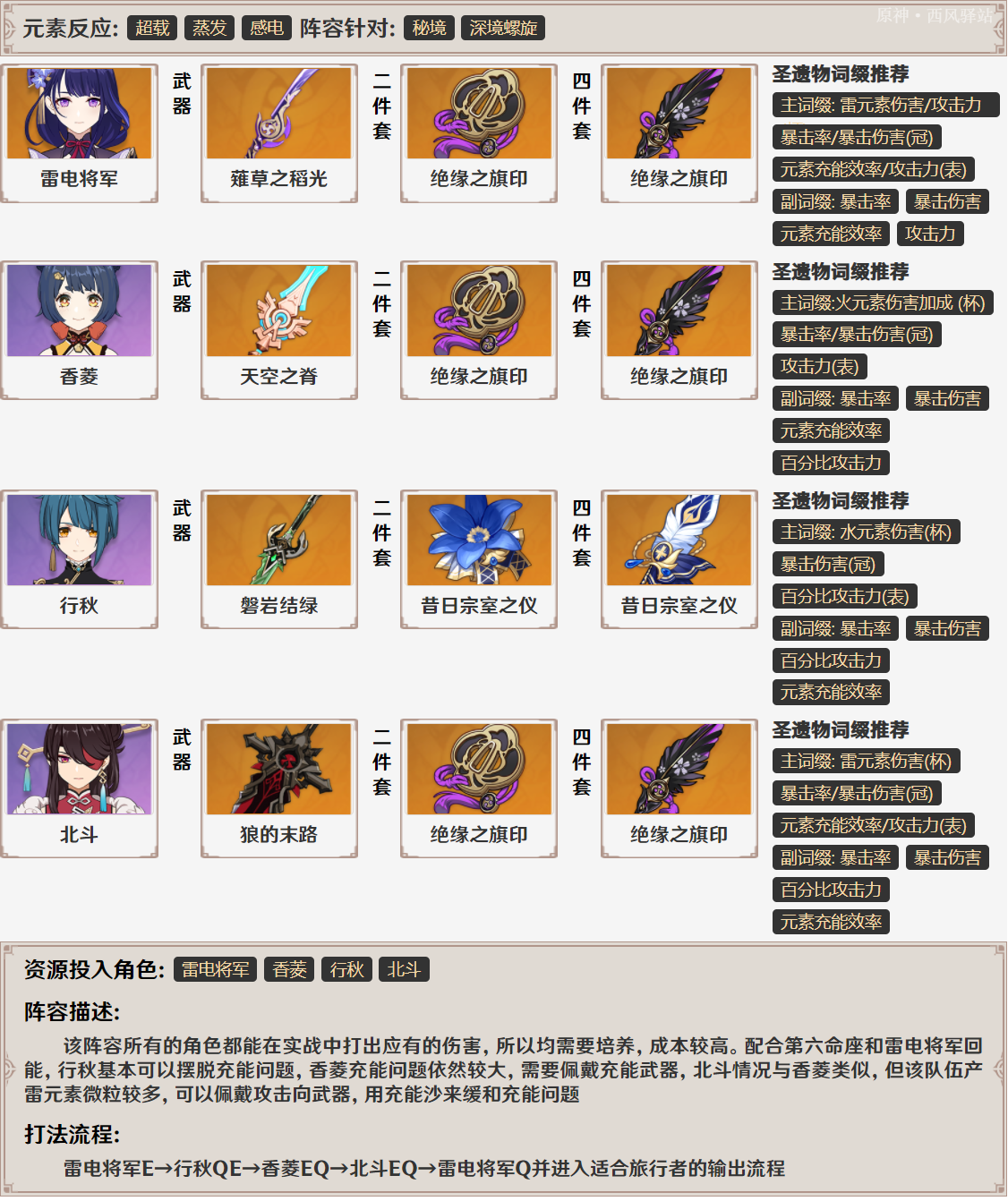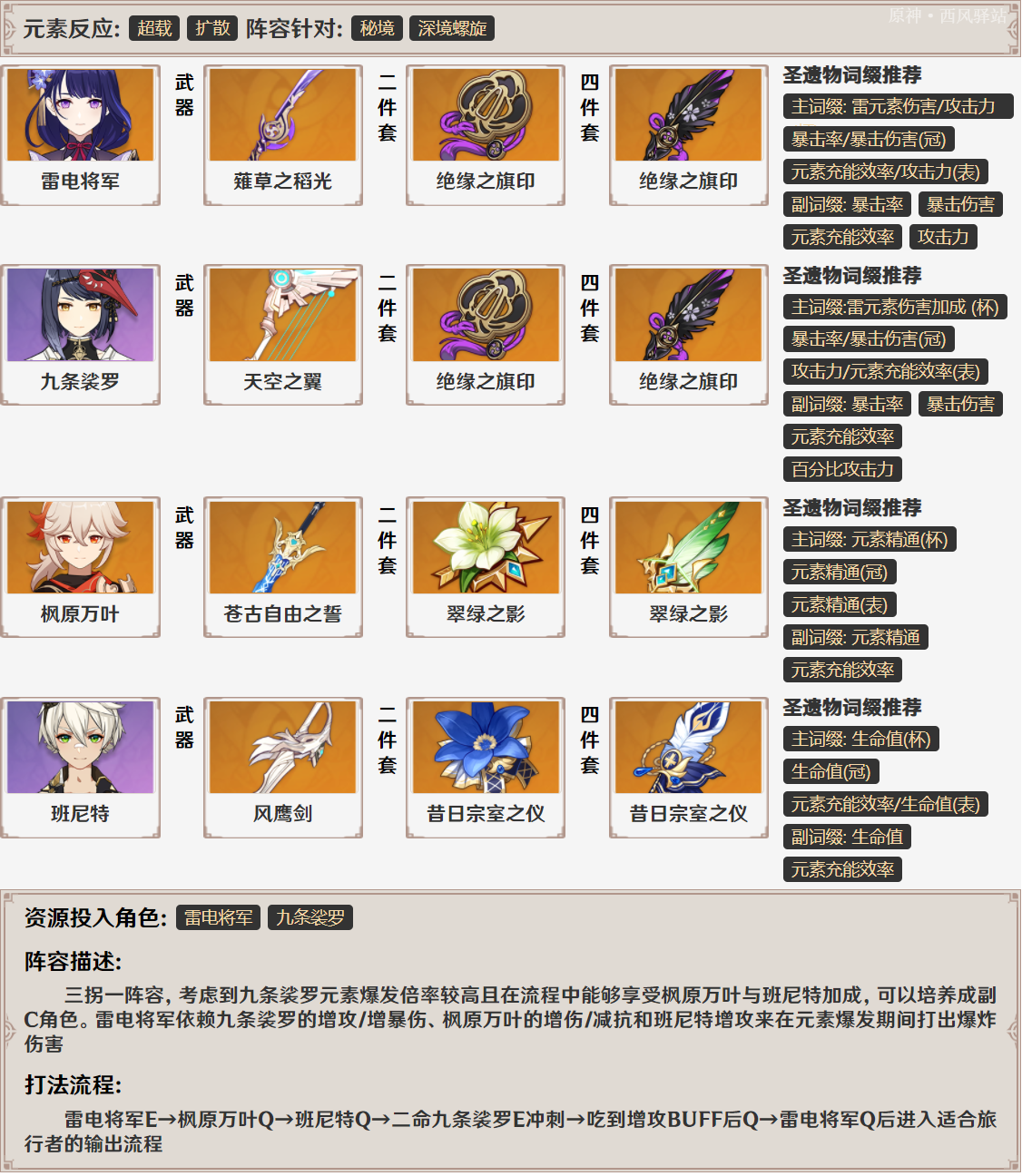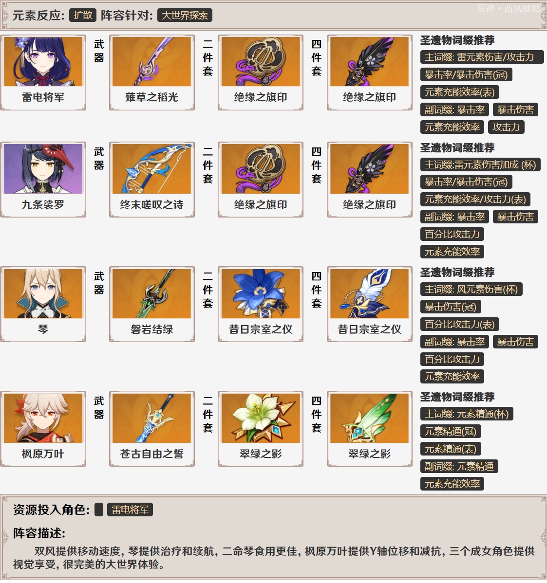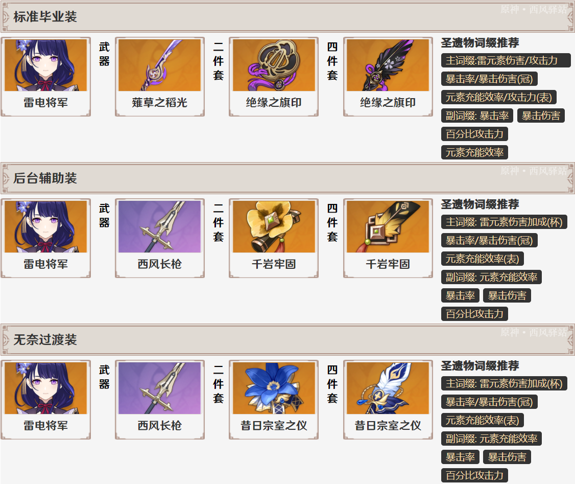 ◎绝缘之旗印四件套:这是雷电将军作为主C时最好的选择——没有之一。二件套提供的元素充能效率在雷电将军的「固有天赋」下可以转化成雷伤加成并提高一心状态下的回能效果;四件套效果是元素充能效率百分比转元素爆发增伤,而一心状态下雷电将军的普攻/重击/下落攻击均视为元素爆发伤害,享受四件套加成;再配合雷电将军突破额外属性——「元素充能效率」,可以说是完美适配的圣遗物套装。