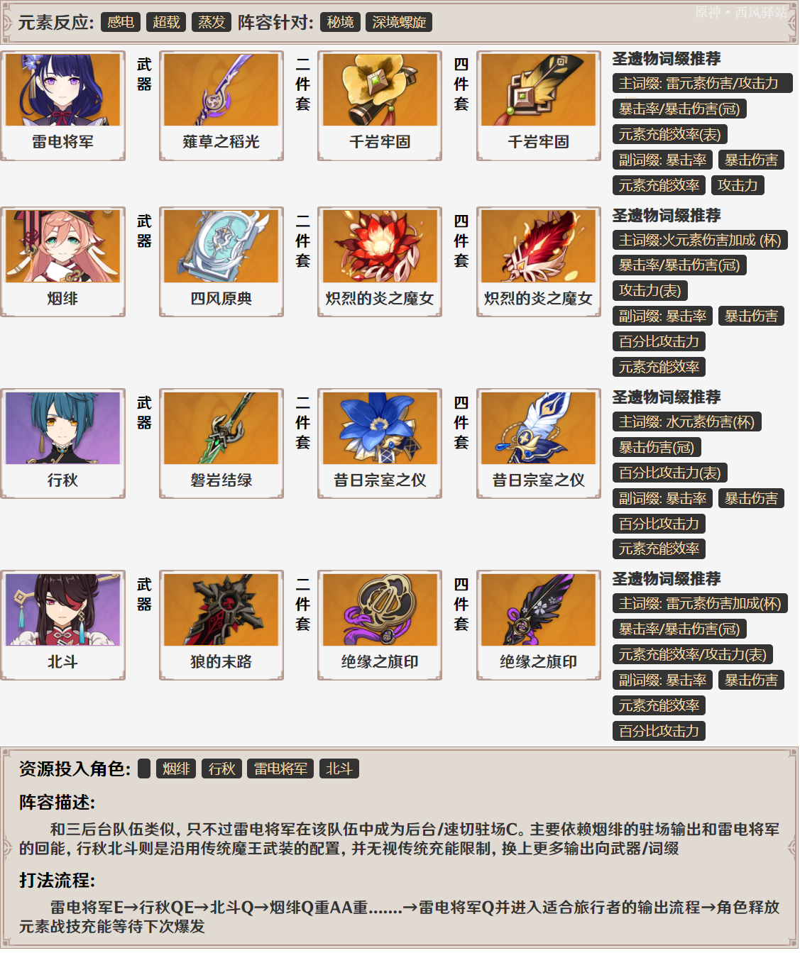 ◎千岩长枪雷神带三后台队伍“香菱、行秋、北斗”时表现会更为优秀。 (全是璃月角色耶!)
