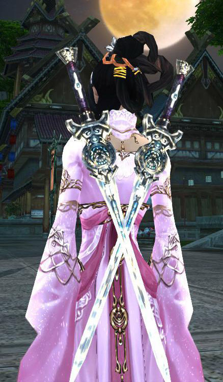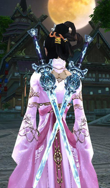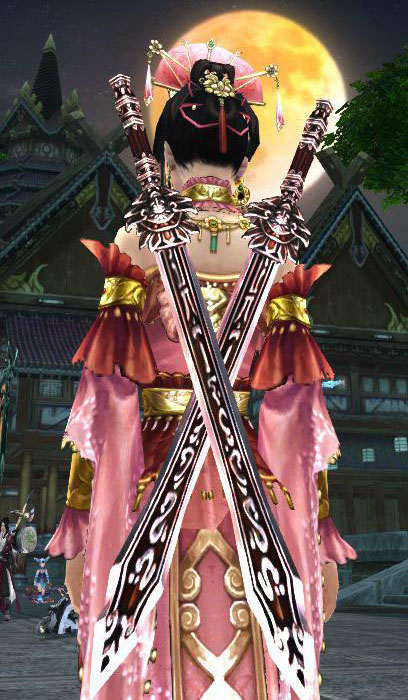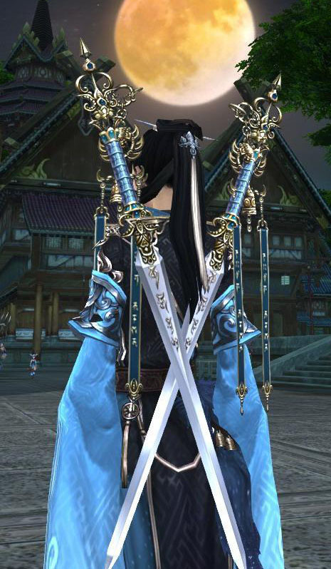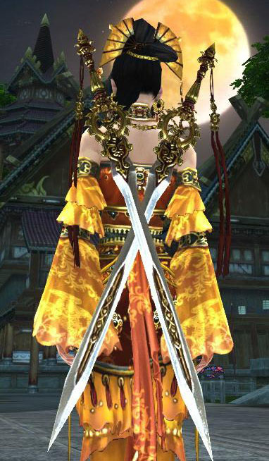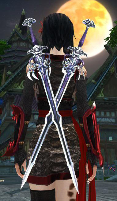 这个是25烛龙殿的输出武器,当时叫做手指双剑,虽然体积比较小,但很有刺客的感觉,配日轮掉落忍者装什么的都很好看,用时尚界的行话来形容就是百搭。