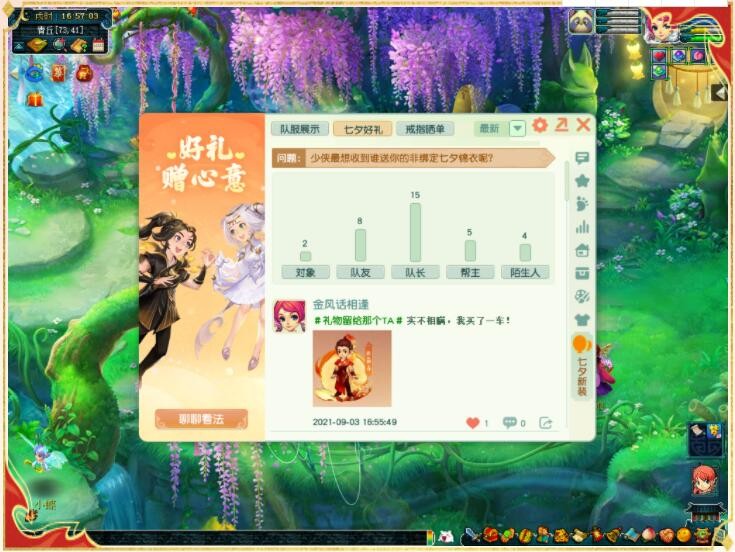活动期间,玩家可以每日和大家投票聊聊自己希望收到谁赠送的七夕礼物,每次投票耗费10点体力。活动期间将从投票的玩家中抽取3名游戏内玩家获得免单七夕锦衣礼盒。