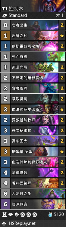 虽然术士又一次被削弱,但是围绕术士任务总是有新的强力构筑出现,由国服玩家主导构筑的防御形态的术士在登顶之后又被多次优化构筑已经日臻成熟,在内战有着可见的优势,有刀的情况下可以考虑留暗影震爆,顺一点5费就可以开任务,出色的解场能力和过牌速度,让术士在平稳进入疲劳阶段之后实现罗姆加古尔丹之手的otk,因为前期并没有随从站场,就算出随从基本也会自己打掉,所以之前任务术的劣势对局法师现在变得好打很多,如果起手有秘银杖,甚至不是很怕超凡之盟。起手可以考虑留巡游向导,后手直接硬币跳了也不错。打任务瞎最好能用低阶牧师锁一下4费。缺点的话就是真的打不过现在的巫妖王锁喉贼,比贼启动慢还没有什么反制手段,前期场面也没有压力,贼可以随便运营自己的节奏,怎么舒服就怎么来,可以考虑带火焰祭坛,如果能撕掉锁喉贼的key可以提高胜率,但是很难撕到,而且火焰祭坛其他对局也没有什么用,这个术士为了更高的稳定性连拾荒者都不带了,选择了更稳定的食魔影豹,一般不会为了针对贼而带火焰祭坛。虽然卡组强度很高,但是如果环境中贼数量太多就考虑玩其他职业吧。