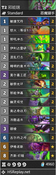 邪能瞎自身优秀的抗快攻属性以及不俗的伤害能力在天梯环境中始终具有一定地位,对阵暗牧猎人快德等卡组,邪能瞎足以依靠自身强力解场回血手段以压倒性优势取胜,与法师萨满术士的对局邪能瞎也拥有足够的伤害配合648杰斯赢下对局。