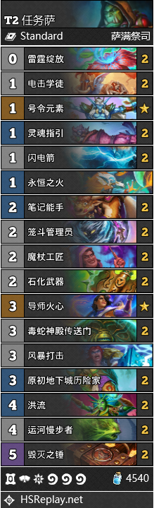 如果你的环境中暗牧泛滥,那么萨满依然是最好的选择。这里说一下萨满打防术时充能召唤尽量去召唤10费,除了废料场巨像,其他随从很难对防术造成压力。