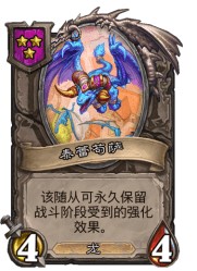 这个随从的被动配合金子塔的技能绝对的完美的搭配。但是有一个不好的点是,前期如果只BUFF一个躁动欺诈者很容易出现送不掉,亡语触发不了的情况。所以最好是2个起手,容错率更高一点。还可以配合鹦鹉和泰蕾苟萨打出配合。
