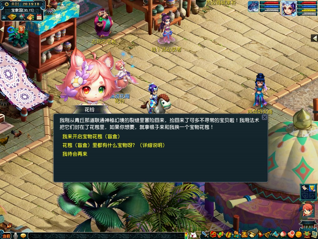 1. 前往宝象国(30,15)花铃处,点击“我来开启宝物花苞(盲盒)”选项即可进入琳琅花阁。