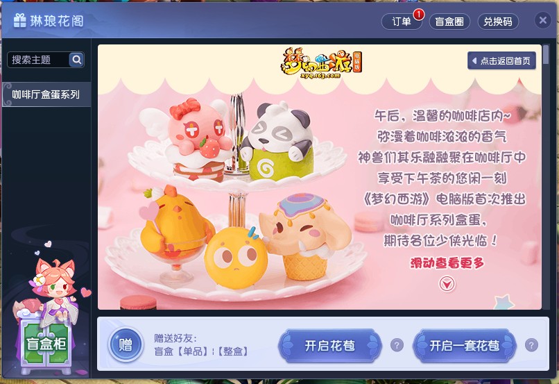 点击查看详情可以浏览选择的盲盒系列商品详情。本次推出的盲盒系列为“《梦幻西游》电脑版咖啡厅盒蛋系列盲盒”。点击海报上的手办也可以查看手办的高清实拍大图。