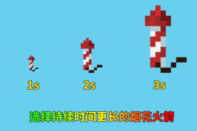 由于鞘翅的耐久仅与烟花的使用次数挂钩,所以减少烟花火箭的使用便能增加鞘翅的寿命。因此,在合成烟花火箭时请务必使用三个火药合成的烟花火箭,它的加速时间可达到3秒,可以有效降低使用烟花火箭的频率。