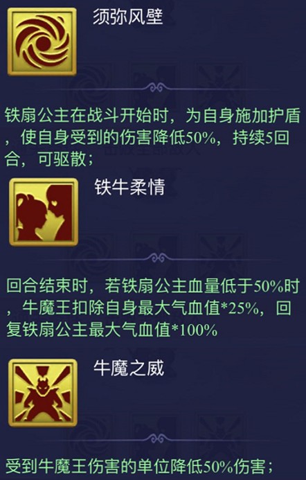 牛魔王:不用管他,牛魔王前四回合每回合扣除25%气血给他老婆回血,第五回合他自己就飞了。但要注意,牛魔王不能被控。