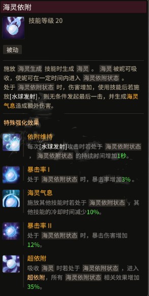超依附可以将海灵依附效果提升35%,触发条件为在海灵依附状态中再次触发海灵依附,选用CD短的技能,能更好的延续BUFF。