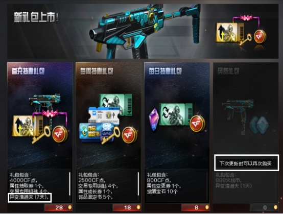 礼包内共有:首冲特惠、每周特惠、每日特惠、免费四种礼包。