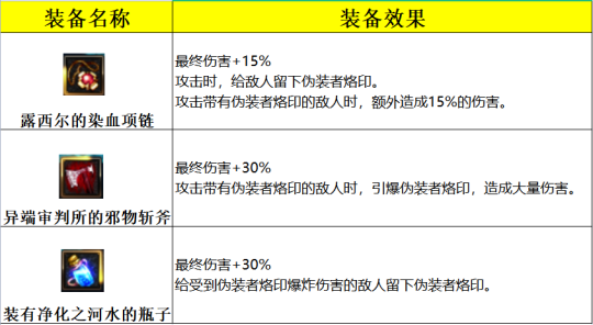 部分领主掉落装备拥有“组合技”属性,最强的莫过于烙印三件套,拥有极高的最终伤害加成,攻击就带有烙印,再次攻击带有烙印的怪物还可引爆烙印,爆炸波及的怪物还会附带烙印。