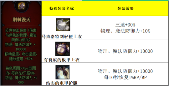 如果是选择走荆棘漫天反伤流派,装备则选择[马杰洛特制轻便板甲上衣]+[有裂痕的板甲上衣]+[结实的重甲护腿],防御力越高,反伤效果更明显。轻便上衣稍微补回荆棘漫天的-50%三速,护腿自带恢复能力效果,提高生存能力。