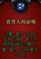 如出门装选择了[真男人的证明],则根据装备特殊属性(每选择一张技能强化牌,力智减少100%),后续不选技能强化牌,应选择基础属性(绿牌)、护石与装备牌,以发挥其最大作用。