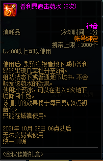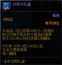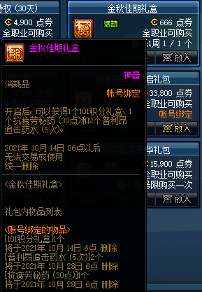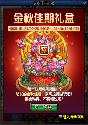 9月28号维护后~10月14号维护前,商城限时上架666点券的【金秋佳期礼盒】,无法使用代币券购买,每周每个账号限购1次。