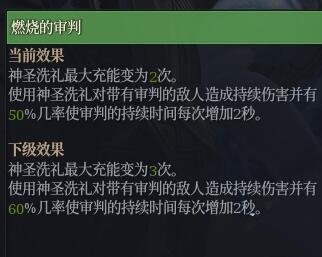 神圣洗礼最大次数增加,使用神圣洗礼X%的几率延长审判的持续时间2秒。点满是神圣洗礼3次充能,百分百增加审判持续时间,必满。