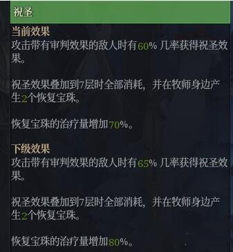 攻击带审判的目标X%的几率获得祝圣效果,7层祝圣自动消耗,在自身周围产生X个小奶球。这个奶球数量和治疗量都是随神佑等级提升的,跟你自身的奶球等级不相关!点满神佑后是百分百获得祝圣效果,消耗7层产生3个小奶球,必须点满!