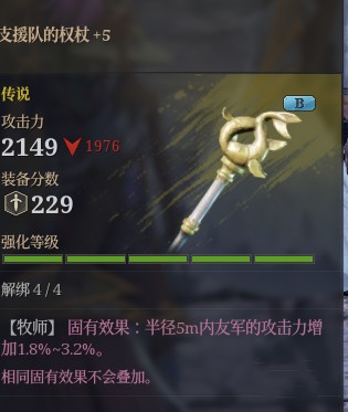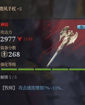 狮心在不打输出的情况下,是很依赖攻速的,攻击就显得没那么必要,毕竟奶脆皮还是很简单的事的。目前攻速武器A级是没有的,那么只能选择B微风手杖和小怪爆的老旧的暴风与刑法手杖。